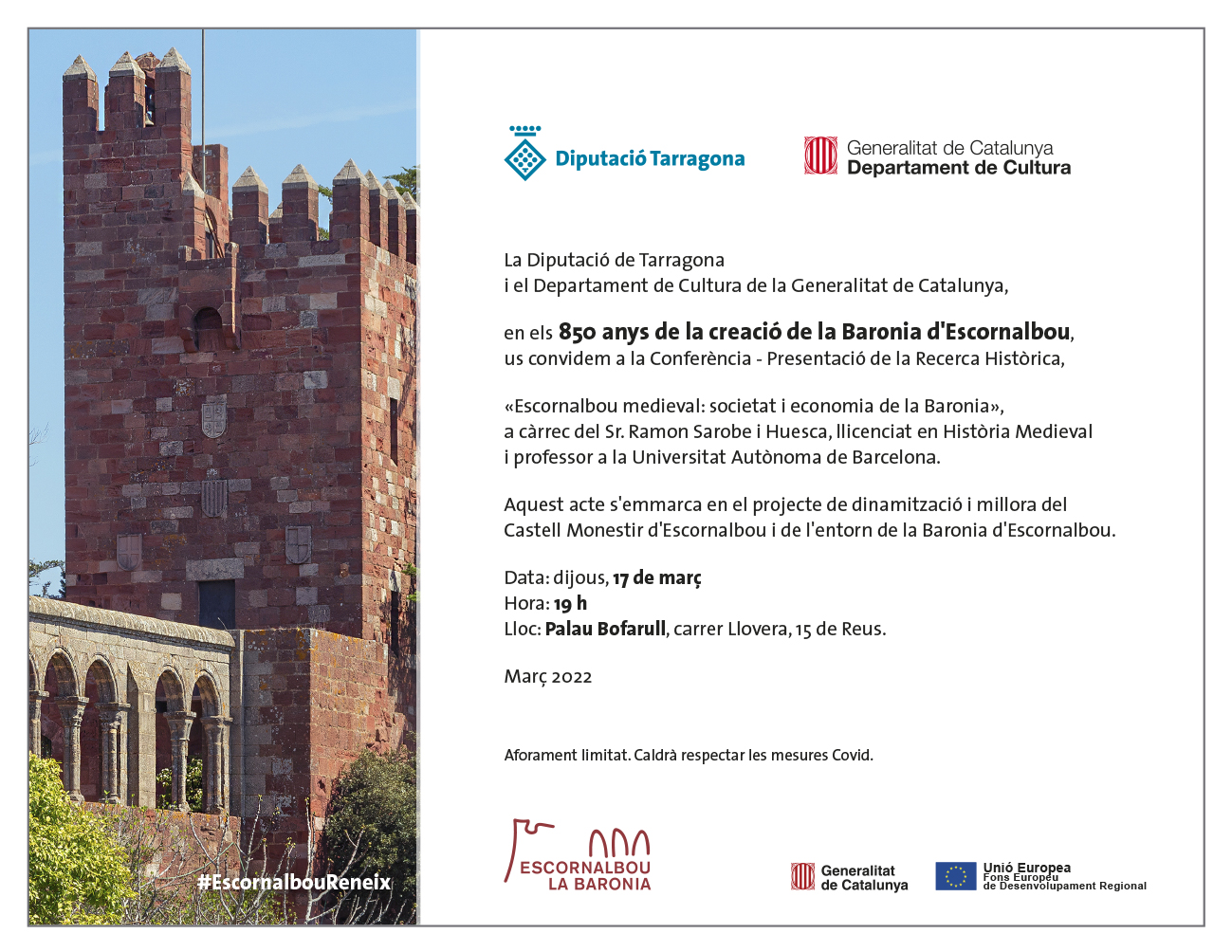 El Sr. Ramon Sarobe i Huesca, llicenciat en Història Medieval i professor a la Universitat Autònoma de Barcelona, impartirà la Conferència -Presentació de la Recerca Històrica «Escornalbou medieval: societat i economia de la Baronia».