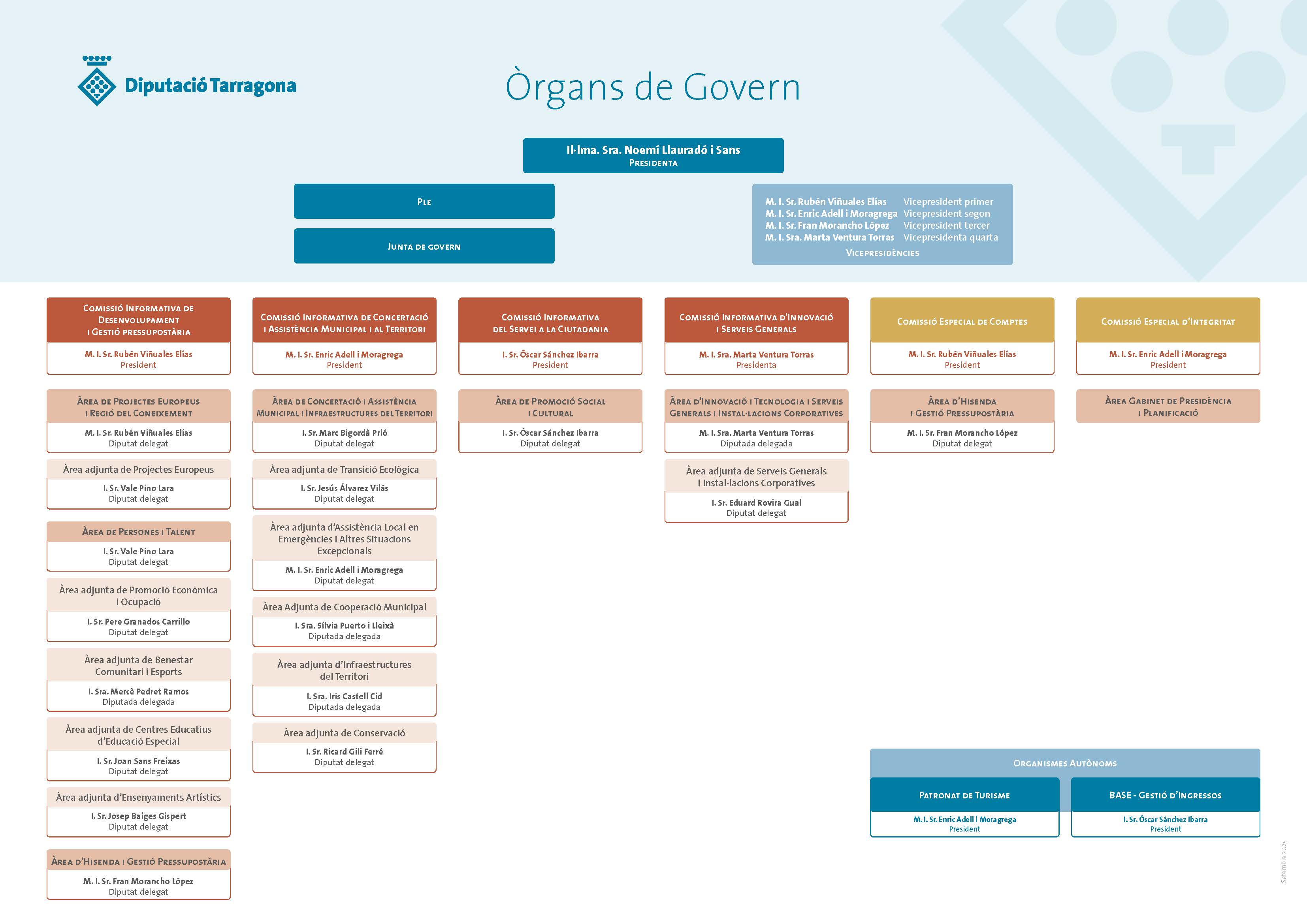 La màxima representació de la Diputació correspon a la presidenta, que governa la corporació assistida pels membres de la Junta de Govern. Presidenta i membres de la Junta són membres escollits del Ple, l’òrgan col·legiat que aprova i sotmet a control el govern.