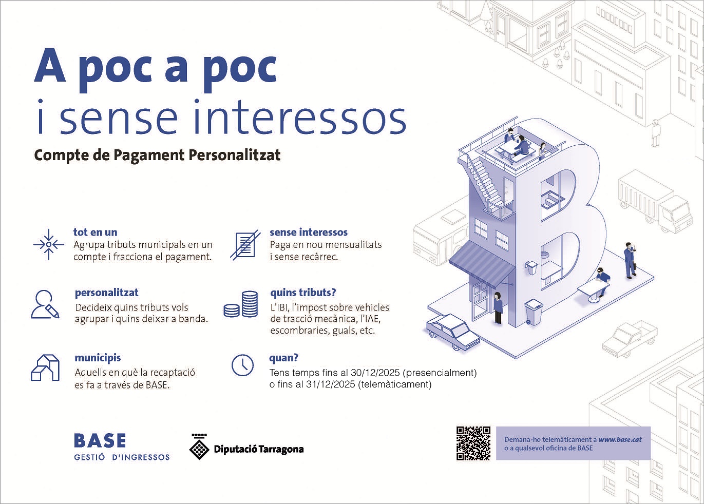El Compte de Pagament Personalitzat de BASE permet agrupar els tributs municipals i pagar-los a terminis i sense interessos. Es tracta d’una eina que facilita el fraccionament i el pagament dels impostos en aquells municipis en què la recaptació està delegada a l’organisme autònom de la Diputació de Tarragona, BASE-Gestió d’Ingressos. Les persones interessades a sol·licitar aquest servei amb vista a l’any 2026, poden fer-ho telemàticament a www.base.cat fins al 31 de desembre, o presencialment a les oficines de BASE fins al 30 de desembre.